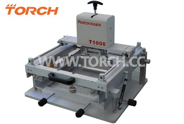3、抬起印刷模板,取出PCB板,完成PCB板上焊盤的錫膏印刷過程。現(xiàn)有的全自動印刷機中帶動刮刀水平運動的傳動裝置主要通過兩個相互平行的導(dǎo)軌配合高精密滾軸絲杠傳動,利用絲杠旋轉(zhuǎn)實現(xiàn)刮刀在水平方向的移動,其方式既有效保證了刮刀水平運動、平穩(wěn)運行的要求,而且印刷出的焊點均勻、可靠;手動印刷機一般采用橡膠刮刀,人工控制刮刀速度,角度和壓力。但是隨著電子行業(yè)的飛速發(fā)展,集成度越來越高的芯片不斷出現(xiàn),對印刷機的印刷精度提出的很大的挑戰(zhàn),特別是對于小型手動印刷機來說,行業(yè)中還停留在“沙模鑄鋁”和“純手動操作”階段,第一,平臺的問題滿足不了高精密的絲網(wǎng)印刷,第二,純手工的刮刀操作,使刮刀的角度,刮刀的壓力,刮刀的移動速度等都變得不可控,第三,精密印刷的一致性也不能保證,所以,T1000手動精密印刷機的出現(xiàn),解決了上述在手動印刷領(lǐng)域不能解決的問題。T1000手動精密印刷機的出現(xiàn),使電子廠僅僅用較低的成本就享受到了高昂的半自動或者全自動印刷機才有的功能,有效減低了生產(chǎn)成本,提高了印刷效率和印刷質(zhì)量。