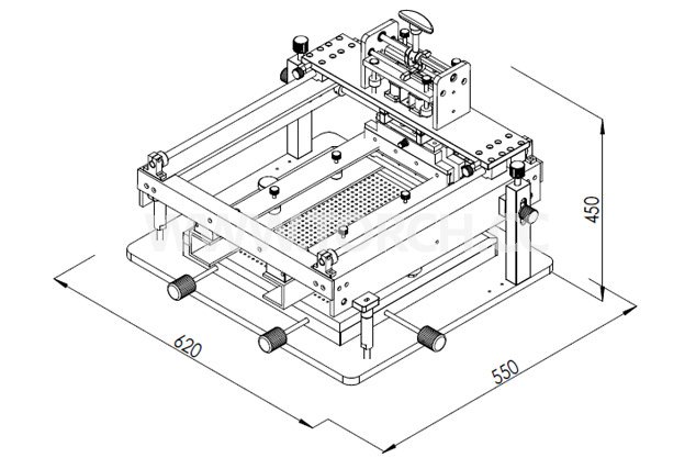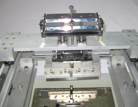 本機x、y、z和角度四軸都可以精密調(diào)整,通過調(diào)整四軸實現(xiàn)PCB板上的焊點和固定于模板框架上的模板相應(yīng)開孔坐標(biāo)的一一對應(yīng),并通過平臺的上升下降調(diào)整PCB和模板之間的距離。